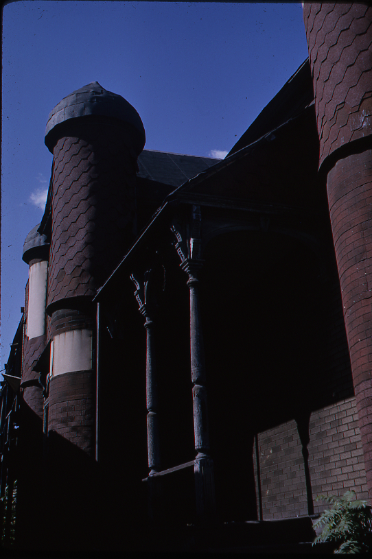 Close-up of vacant house located at 657 Elmwood, at the corner of E. Fort Street in Detroit. Two-story house has simulated brick siding, covered entry porch and turrets with onion domes. Handwritten on slide mount: "657 Elmwood, S.W. corner Elmwood, E. Fort St., 10-4-64."