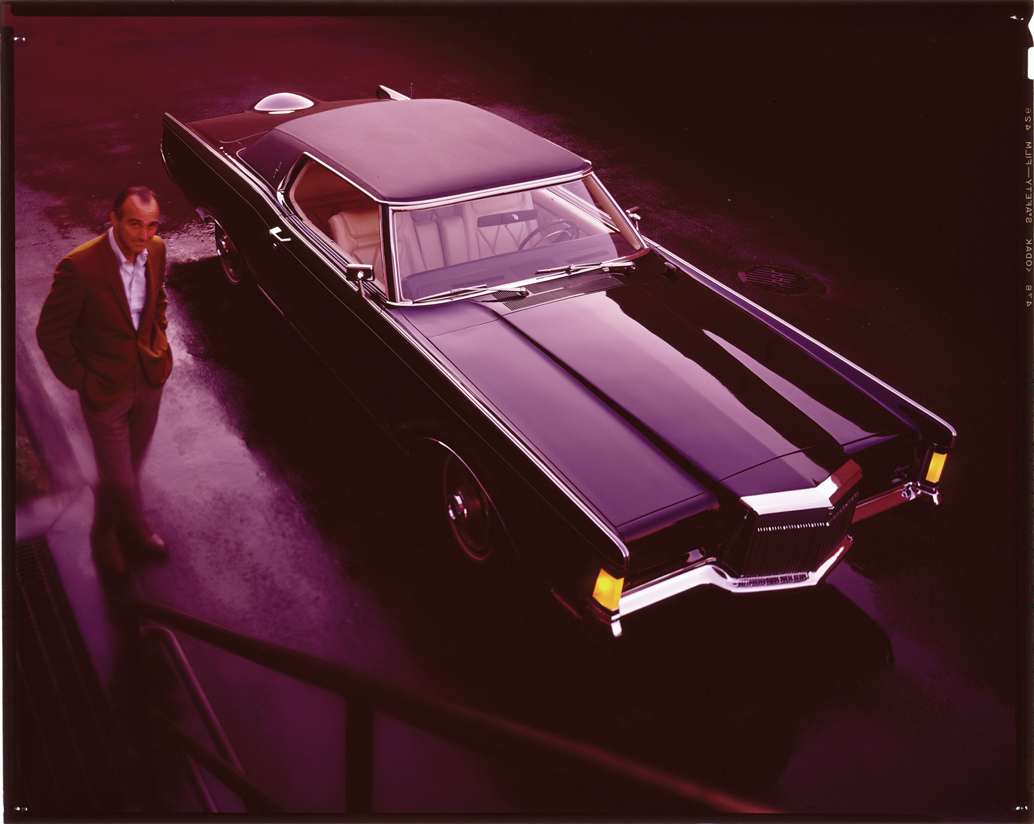 View of a man posing with a Lincoln Continental Mark III coupe. Label on sleeve: "Ford Motor Co., Lincoln Mark III, 1968-71."