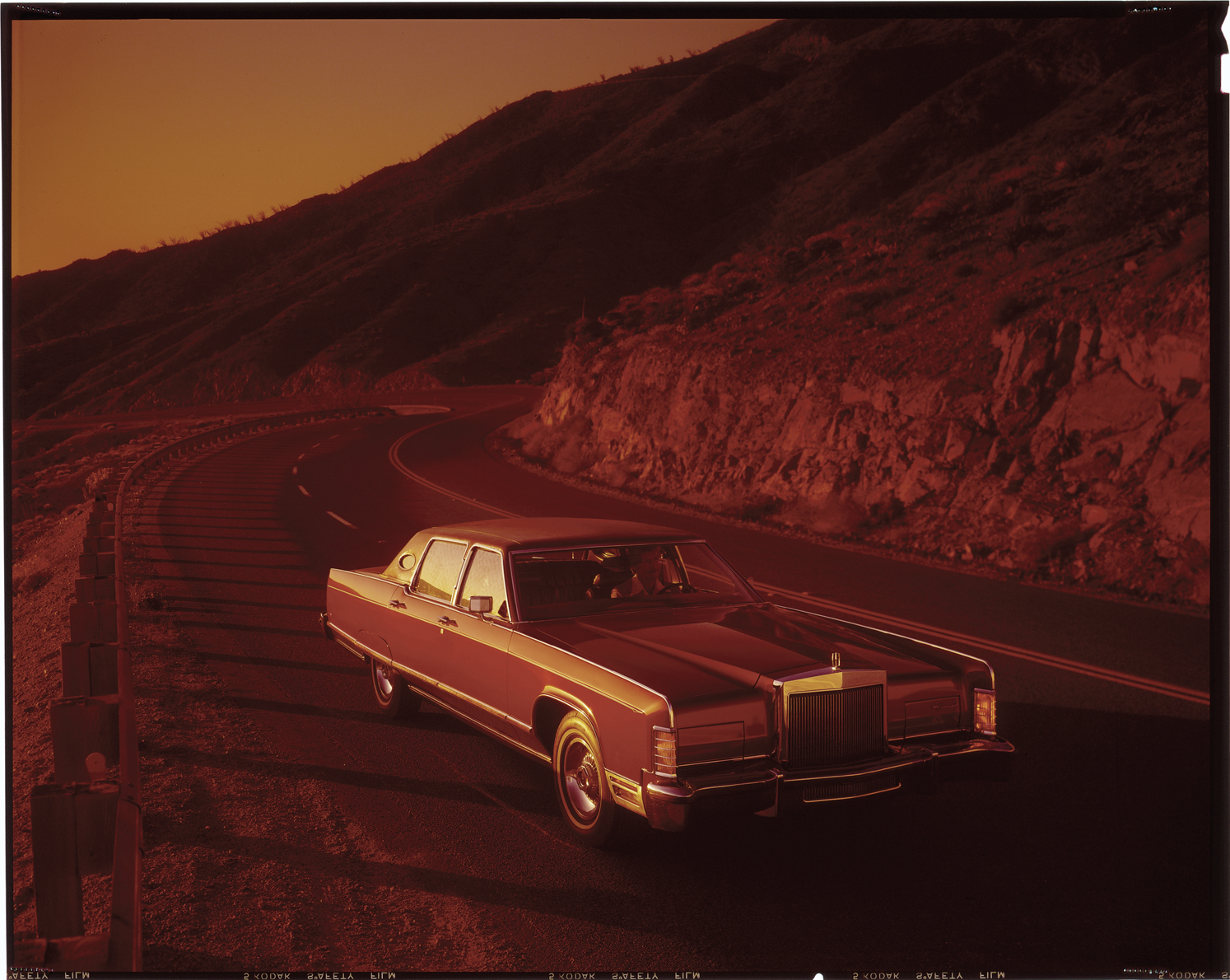 View of a man driving a Lincoln Continental sedan. Label on sleeve: "Ford Motor Co., Lincoln Continental, 1976-77."
