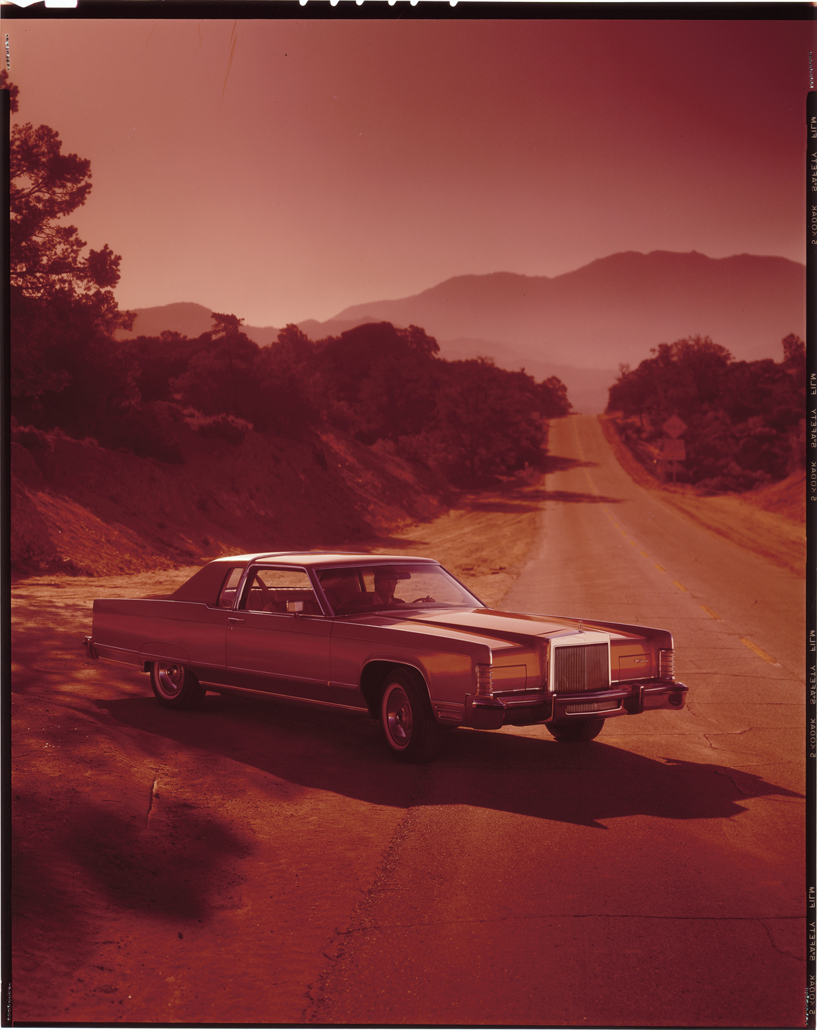 View of a man driving a Lincoln Continental coupe. Label on sleeve: "Ford Motor Co., Lincoln Continental, 1976-77."
