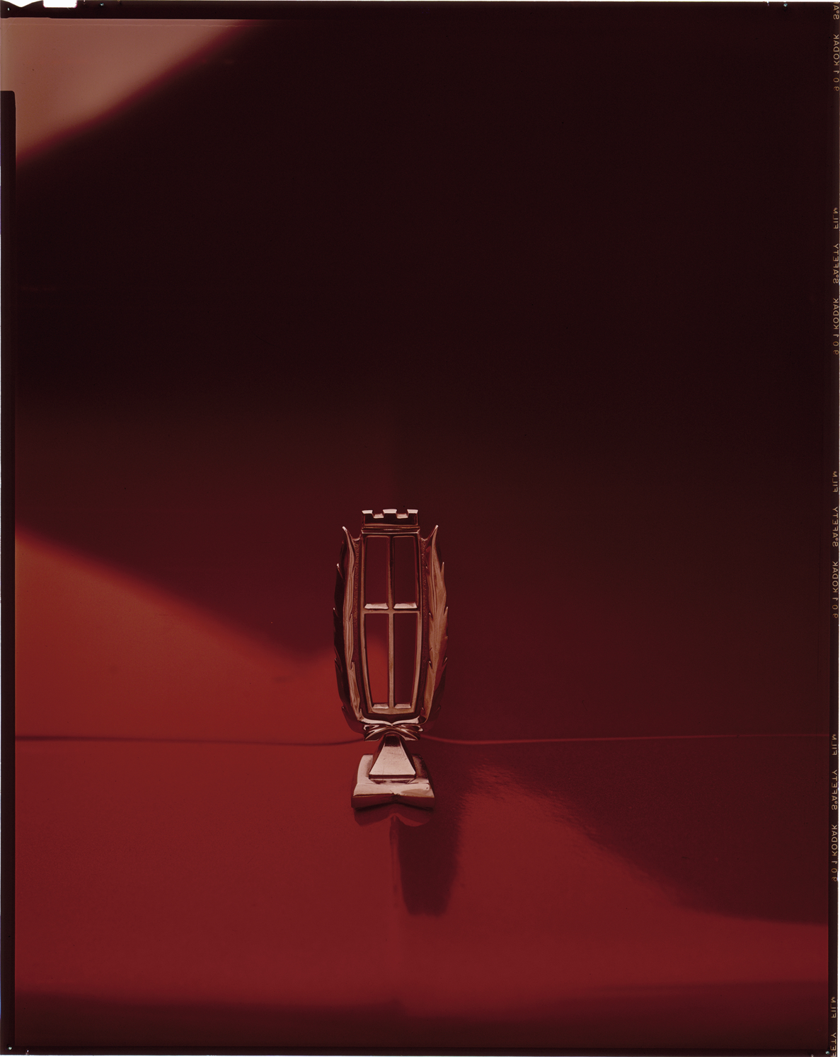 View of a Lincoln automobile hood ornament. Label on sleeve: "Ford Motor Co., Lincoln hood ornament, date unknown."