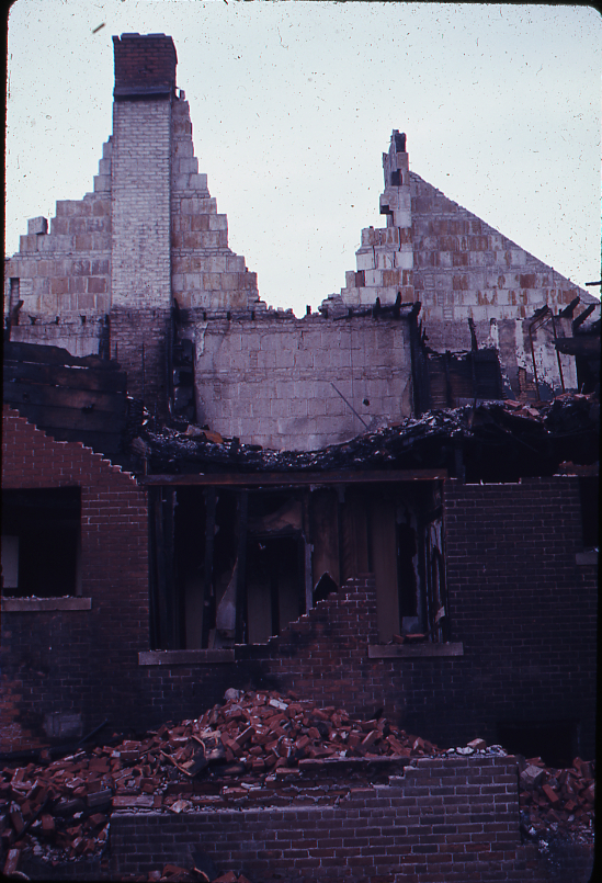 View of brick building damaged by fire during the 1967 riots in Detroit.