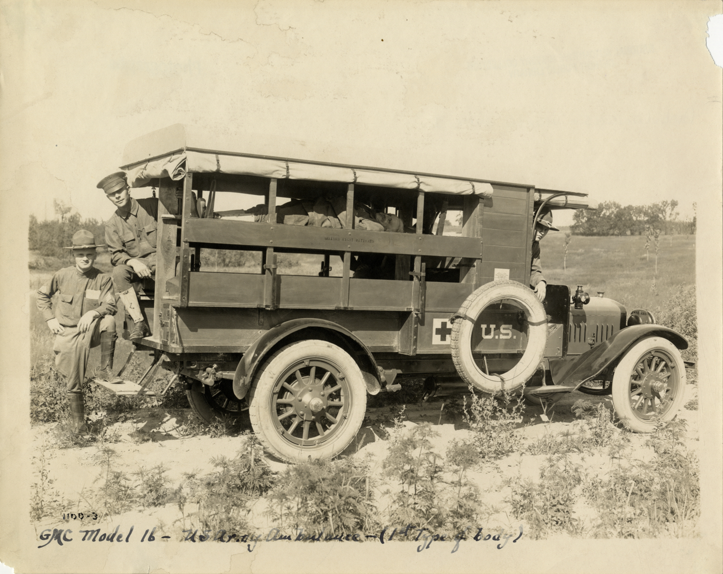 View of soldiers posing with a 1916 GMC Model 16 ambulance. Handwritten on front: "GMC Model 16, US Army ambulance (1st type of body)."