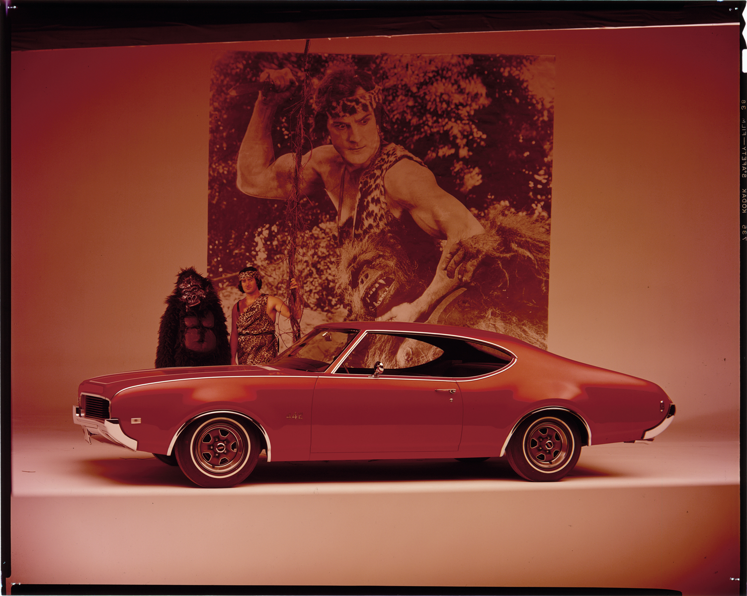 View of costumed models, as Tarzan and an ape, posing with a 1969 Oldsmobile 442 coupe. Film still in background. Label on sleeve: "General Motors, Oldsmobile, 4-4-2, 1969."