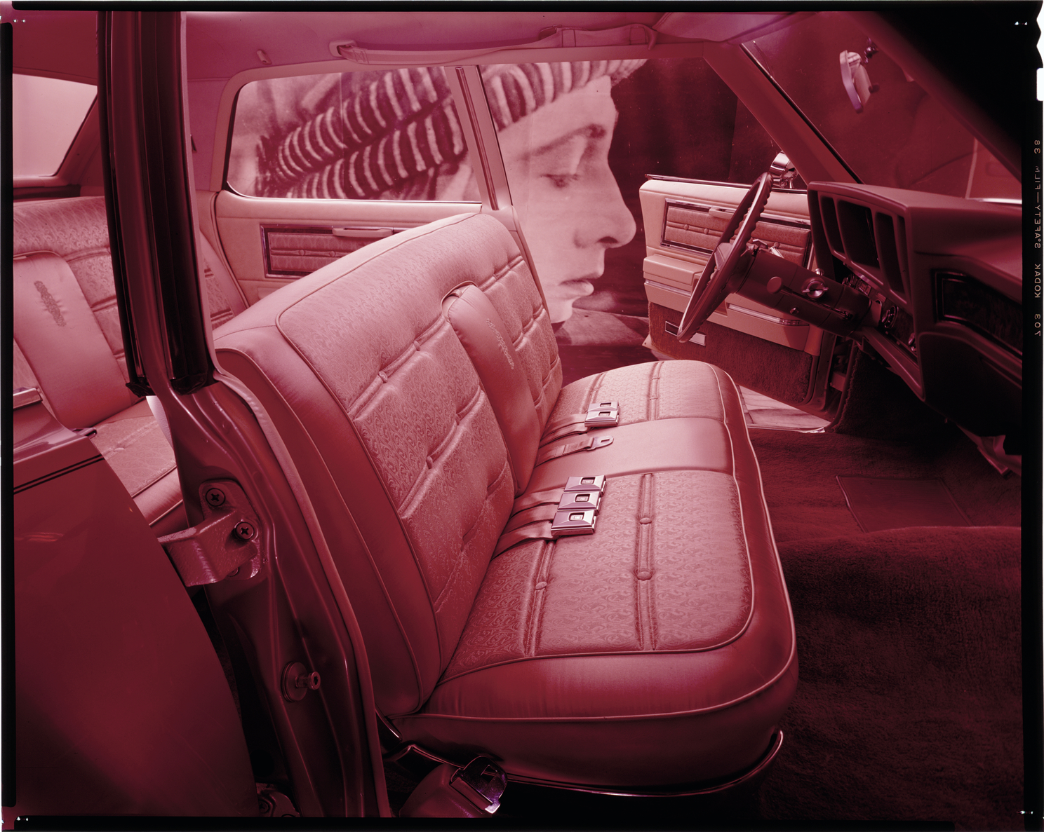 View of the interior of a 1969 Oldsmobile sedan, showing steering wheel and front and rear seats. Film still in background. Label on sleeve: "General Motors, Oldsmobile, interior, 1969."