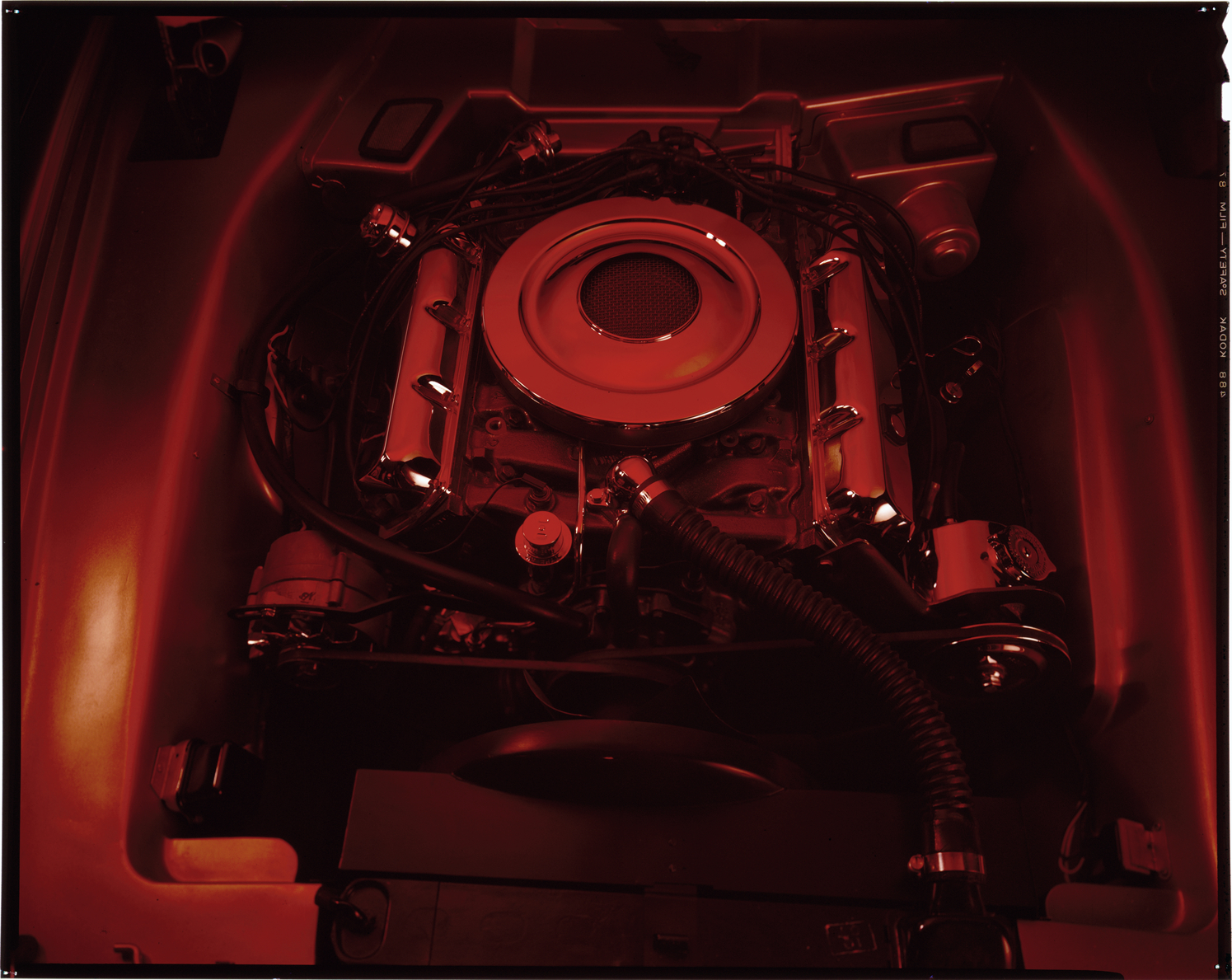 Close-up view of the motor for a Plymouth automobile. Label on sleeve: "Chrysler Corp., Plymouth engine, date unknown."
