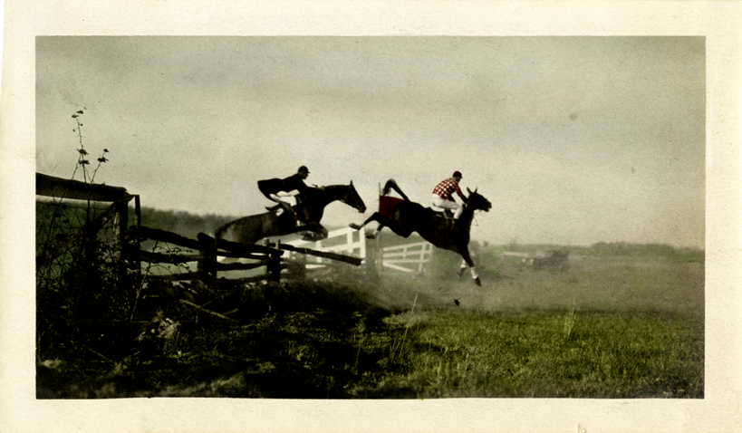 View of horses and riders jumping over fences during the Grosse Pointe Hunt Club Point-to-Point Challenge Cup Race at the Bloomfield Open Hunt. Handwritten on back: "Open Hunt Races, 1 Nov. 1924. From album by Wm. H. Bruss. Taking a barrier in the Grosse Point [sic] Hunt Point-to-Point Challenge Cup Race."