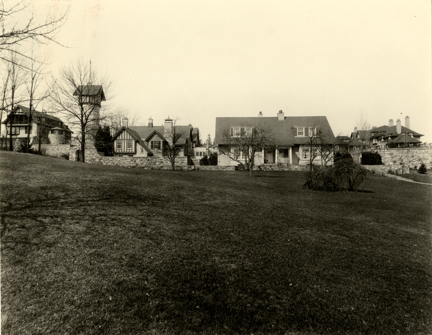View of house and Tudor-style buildings on the grounds of Cranbrook in Bloomfield Hills, Michigan. Label on back: "House."
