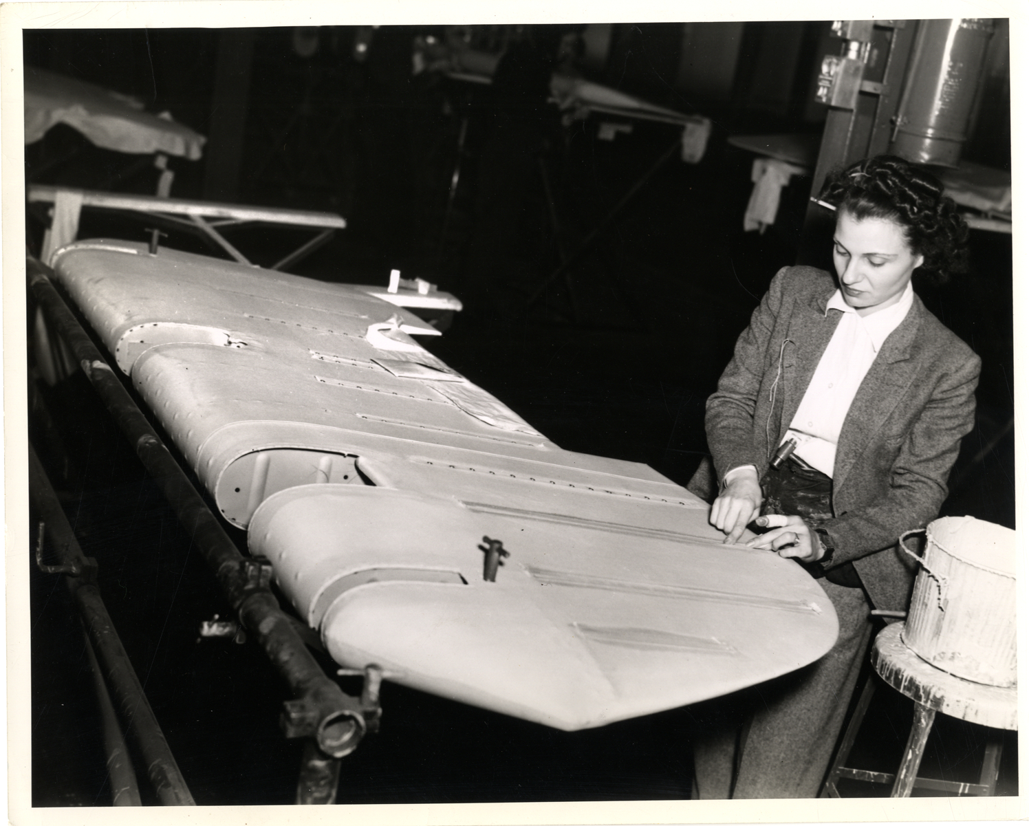 Lillian Mardina affixing pin and dope tape to B-25 bomber rudder fin