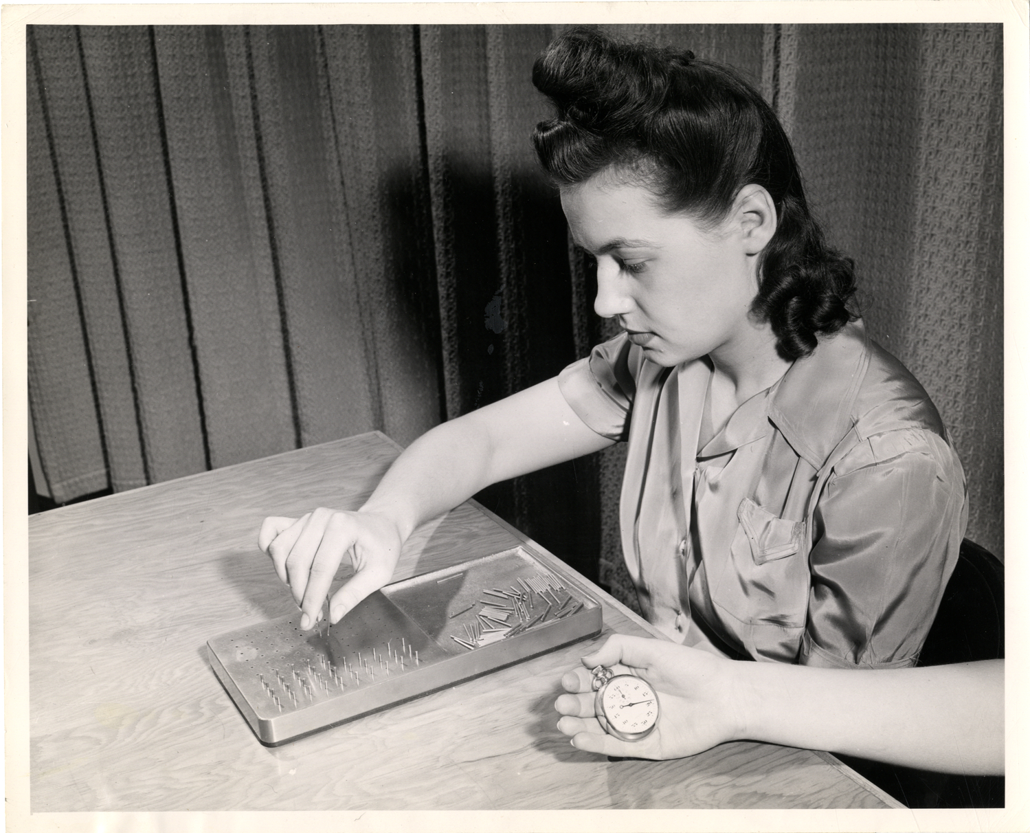 View of a woman worker taking a test for manual dexterity at the AC Spark Plug Division plant. Woman's hand holding stopwatch in foreground. Label on back: "This is one of several tests measuring skill and accuracy in the use of small tools." Handwritten on back: "AC Spark Plug Div. Women workers."