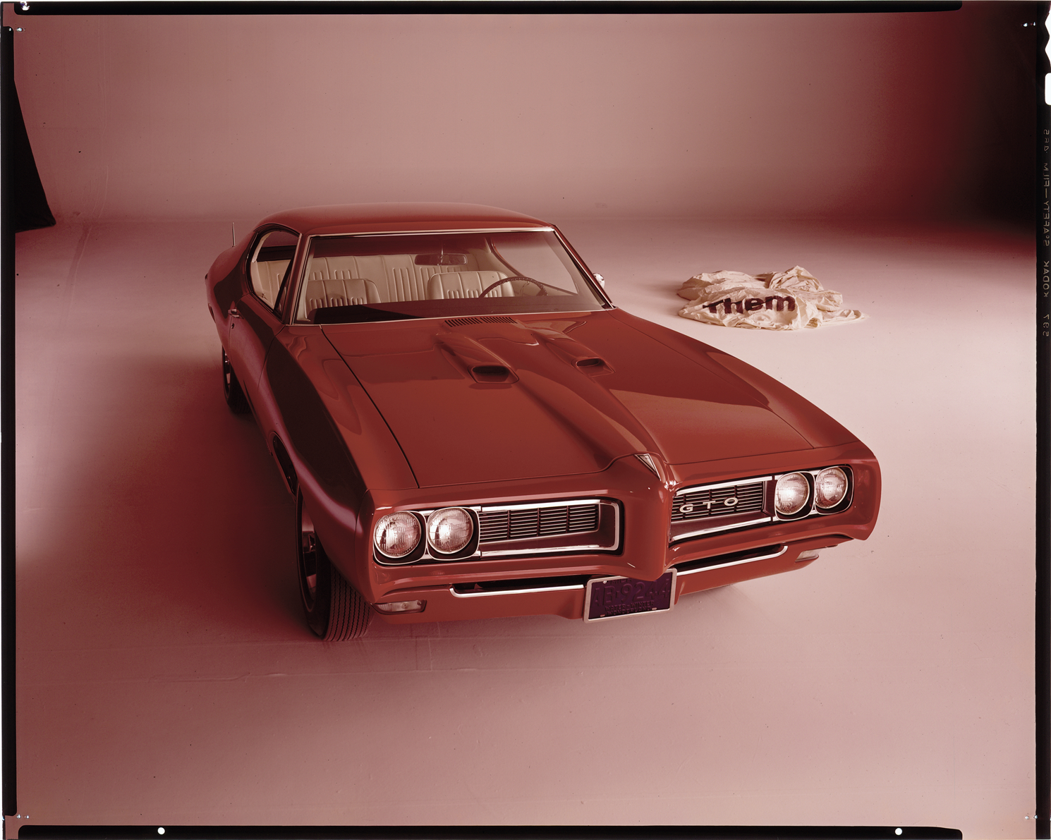 View of a 1968 Pontiac GTO coupe. Crumpled tarpaulin lettered with "Them" in background. Label on sleeve: "General Motors, Pontiac GTO, 1968."