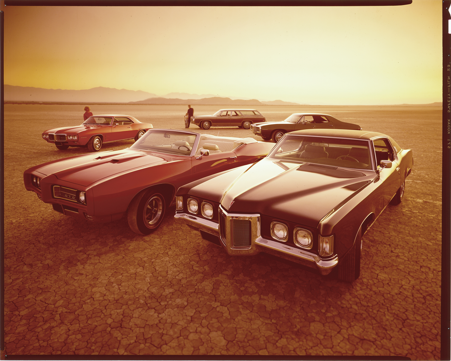 View of a man and woman posing with several 1969 Pontiac automobiles, including coupes, station wagon and convertible. Label on sleeve: "General Motors, Pontiac full line, 1969."