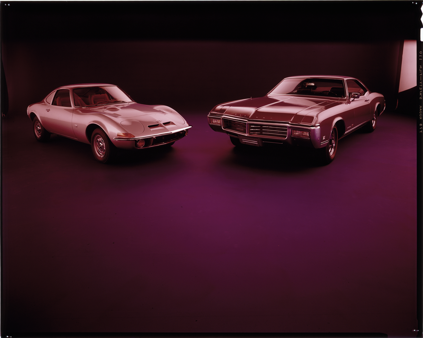 View of a 1969 Opel GT coupe and a 1969 Buick Riviera coupe. Label on sleeve: "Opel GT, 1969. Buick Riviera, 1969."