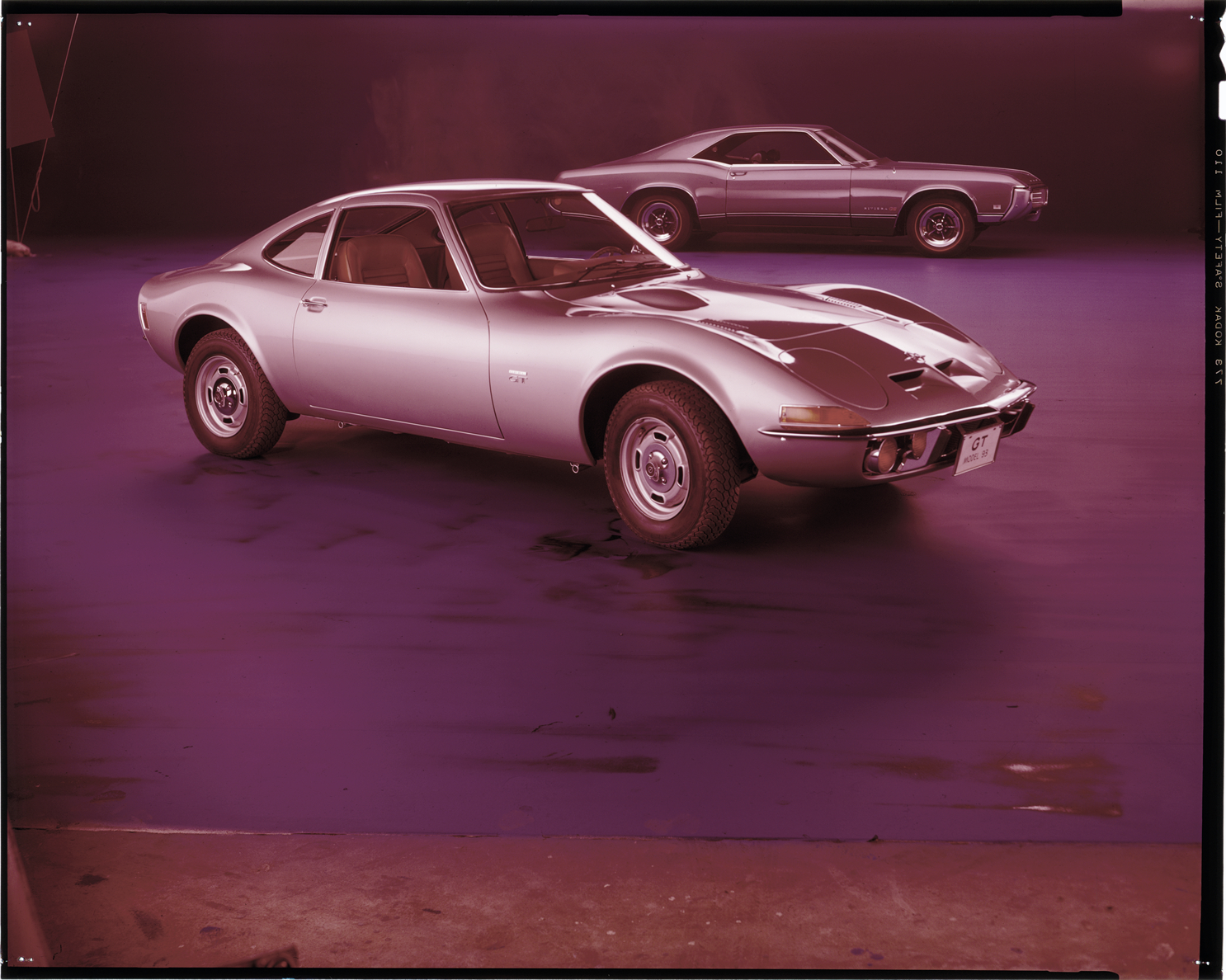 View of a 1969 Opel GT coupe. 1969 Buick Riviera coupe in background. Label on sleeve: "Opel GT coupe, 1969. Buick Riviera, 1969"