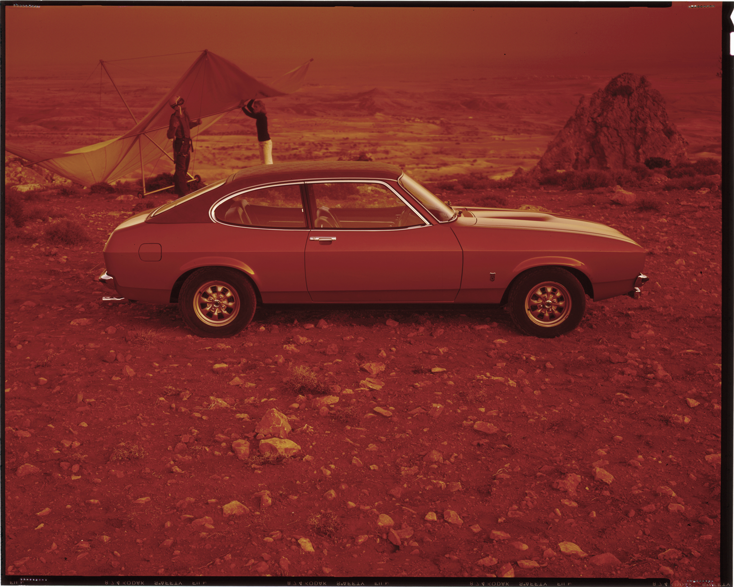 View of a Ford Capri Mark II coupe. Man and woman with parasail in background. Label on sleeve: "Ford (Europe), Ford Capri II, 1970s."