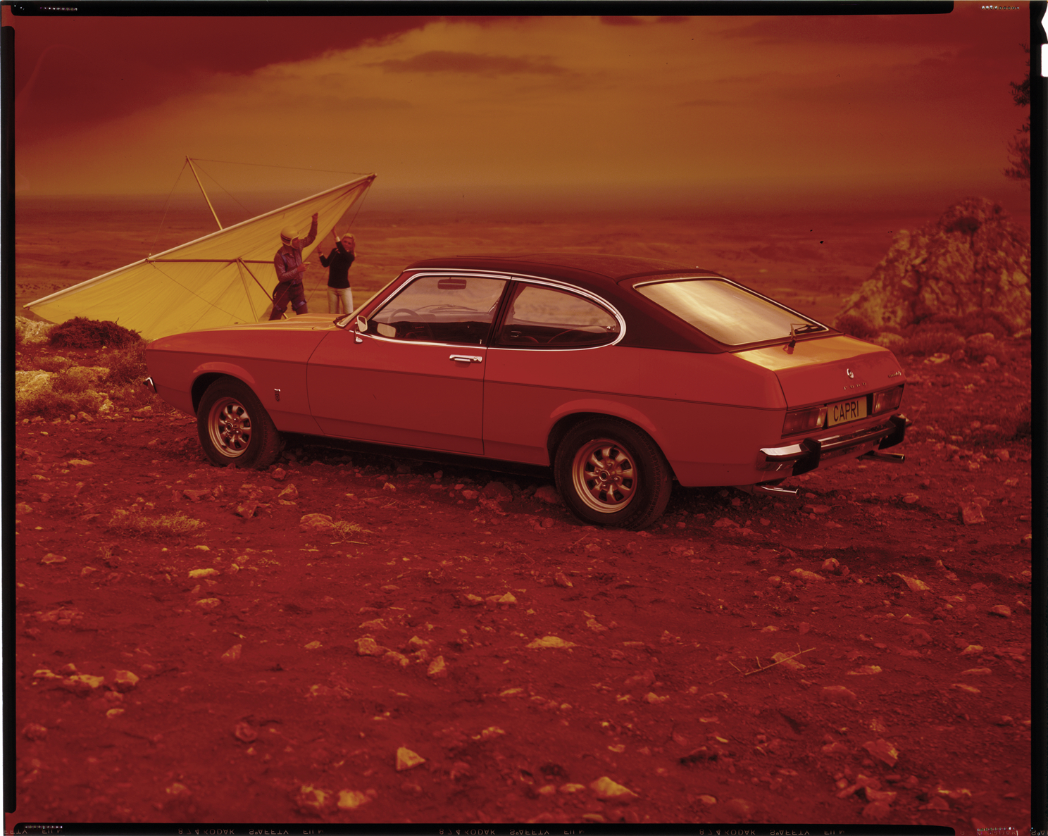 View of a Ford Capri Mark II coupe. Man and woman with parasail in background. Label on sleeve: "Ford (Europe), Ford Capri II, 1970s."