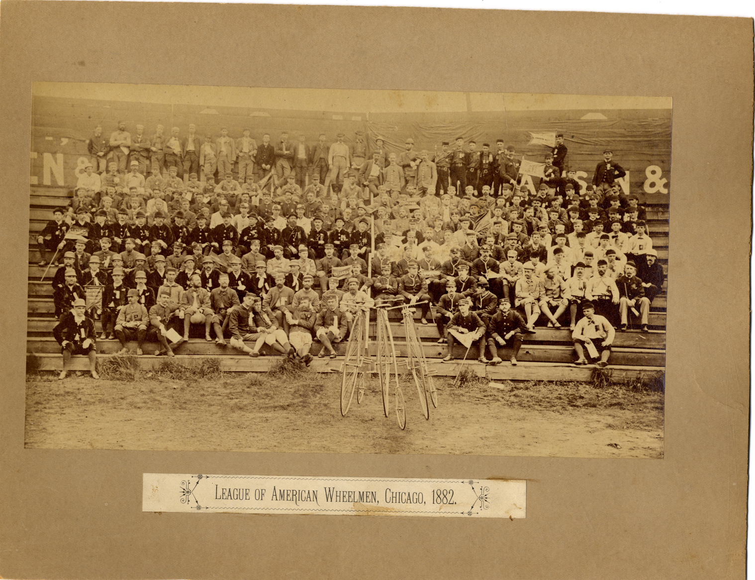 View of members of the League of American Wheelmen, posing on bleachers. Three high wheel bicycles in foreground. Label on front: "League of American Wheelmen, Chicago, 1882." Handwritten on back: "Subject: Bicycles--Cycling Clubs. Collection: MS3/Charles E. Duryea Collection. Date: 1882. Source: Estate of Charles E. & M. Jerry Duryea. I.D.: League of American Wheelmen, Chicago."