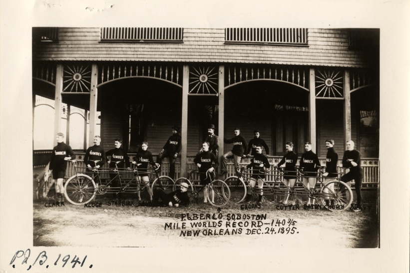 View of members of the Humber Bicycle Club, posing with bicycles in front of wooden-frame building. Peter J. Berlo in center of group. Printed on front: "P.J. Berlo, So. Boston. Mile world's record, 1.40 3/5. New Orleans, Dec. 24, 1895. Clark, Kluge, Starbuck, [undecipherable], Crooks, Cutter, Eaton, Church, Beavy." Handwritten on front: "P.J.B. 1941." Typed on back: "Subject: Bicycles--Cycling Clubs. Collection: MS3/Charles E. Duryea Collection. Date: 1895. Source: Estate of Charles E. & M. Jerry Duryea. I.D.: Humber Bicycle Club, Peter J. Berlo, world's champion bicycle rider (see correspondence in MS/Duryea letter dated 23 Oct 1941)." Handwritten on back: "With best regards, P.J. Berlo, Oct. 23, '41."