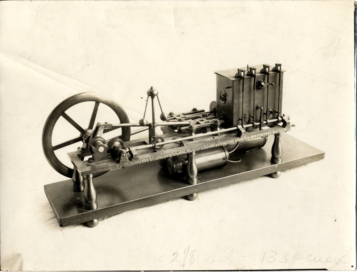 Model of Stuart Perry's 1844 gasoline engine. Typed on back: "Subject: Engines--Early models. Collection: MS3/Charles E. Duryea Collection. Date: 1920's. Source: Estate of Charles E. & M. Jerry Duryea. I.D.: Stuart Perry's engine, 1844. From the U.S. Patent Office model collection." Handwritten on back: "Photo of model of Stuart Perry's engine, 1844-46. From Patent Office model collection."