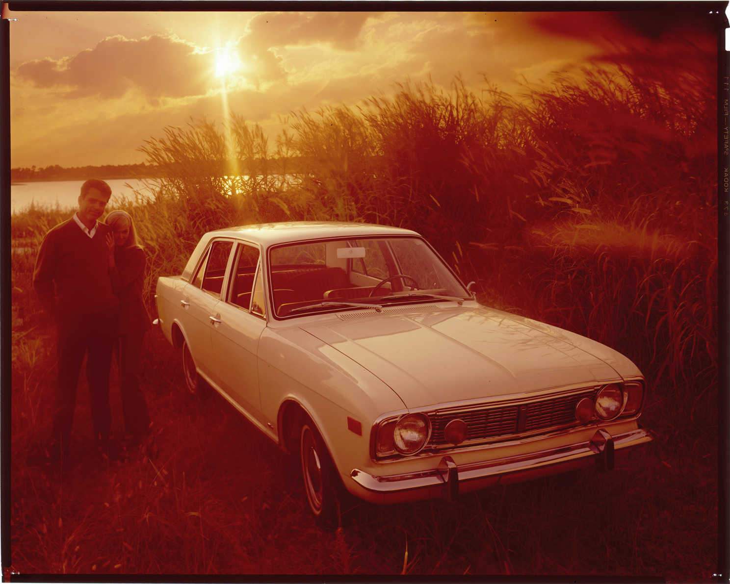 View of a man and woman posing with a 1969 Ford Cortina Mark II sedan. Label on sleeve: "Ford (British), Ford Cortina Mark II, 1969."