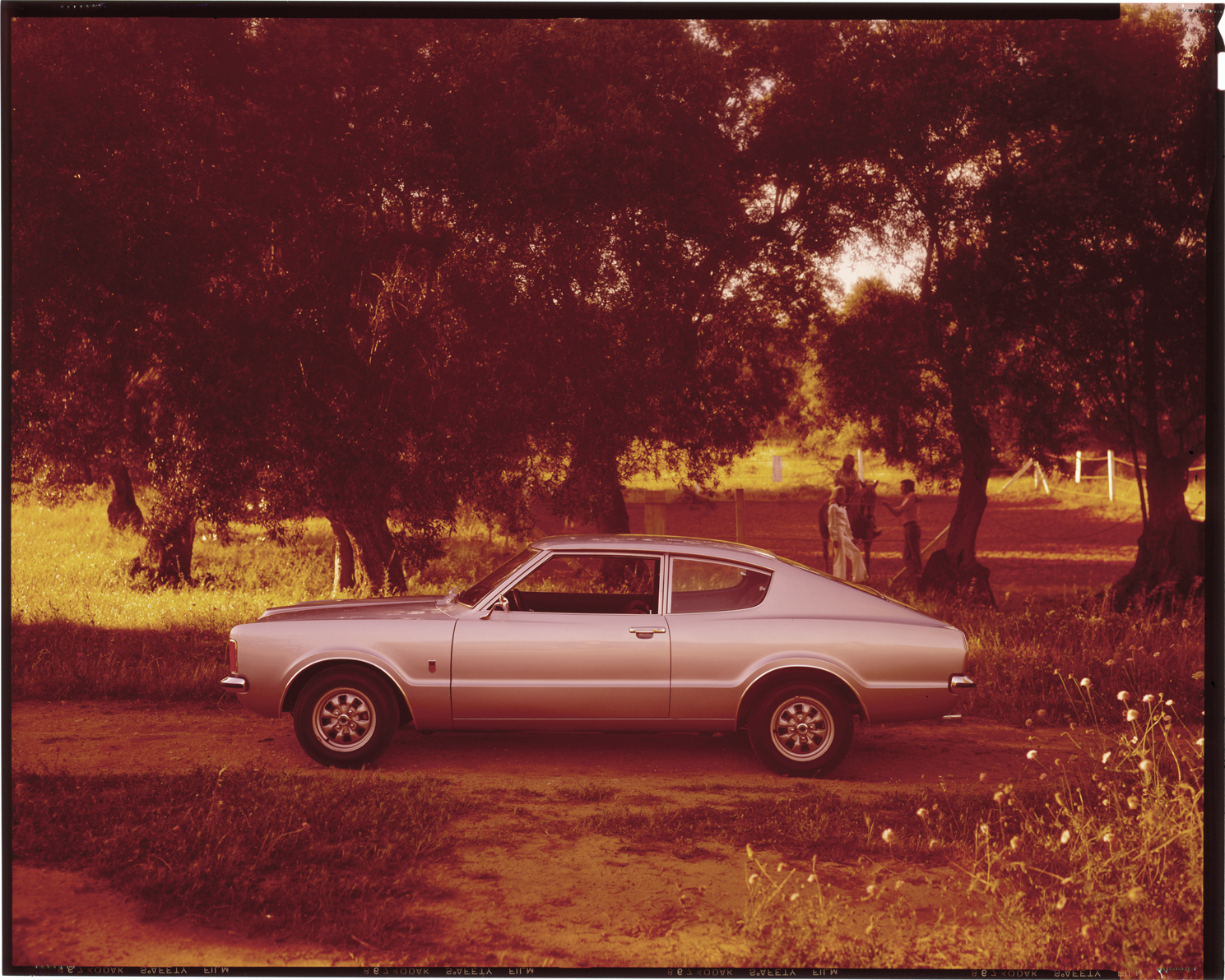 View of a Ford Cortina coupe. Two women, a man and a horse in background. Label on sleeve: "Ford (British), Ford Cortina, 1970s."