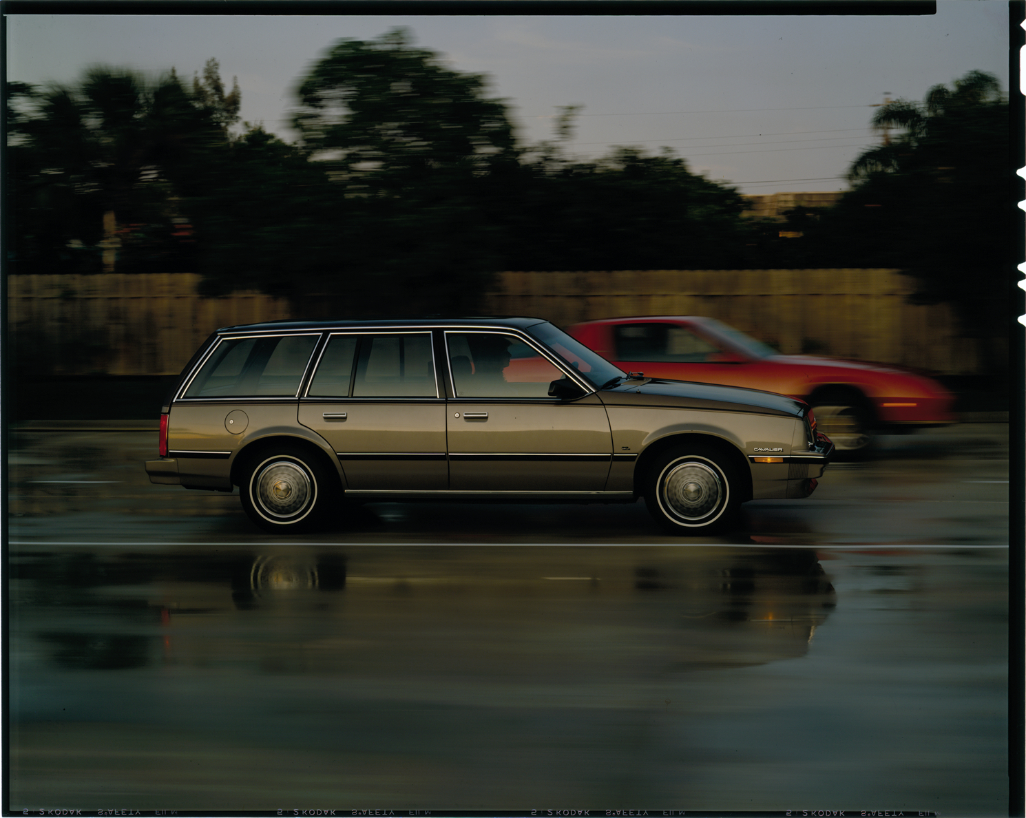 View of a 1982 Chevrolet Cavalier station wagon. Unidentified car in background. Label on sleeve: "General Motors, Chevrolet wagon, 1982."