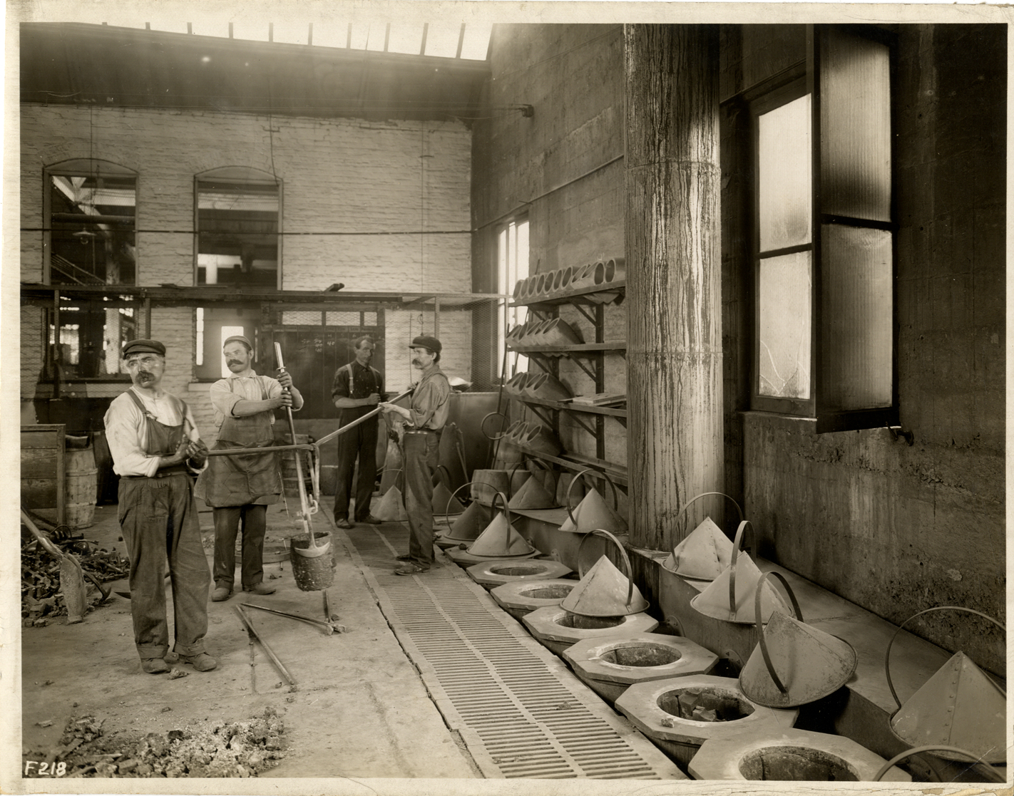 View of foundry workers at the Willys-Overland Company factory. Handwritten on back: "Factories--Overland, ca. 1909."