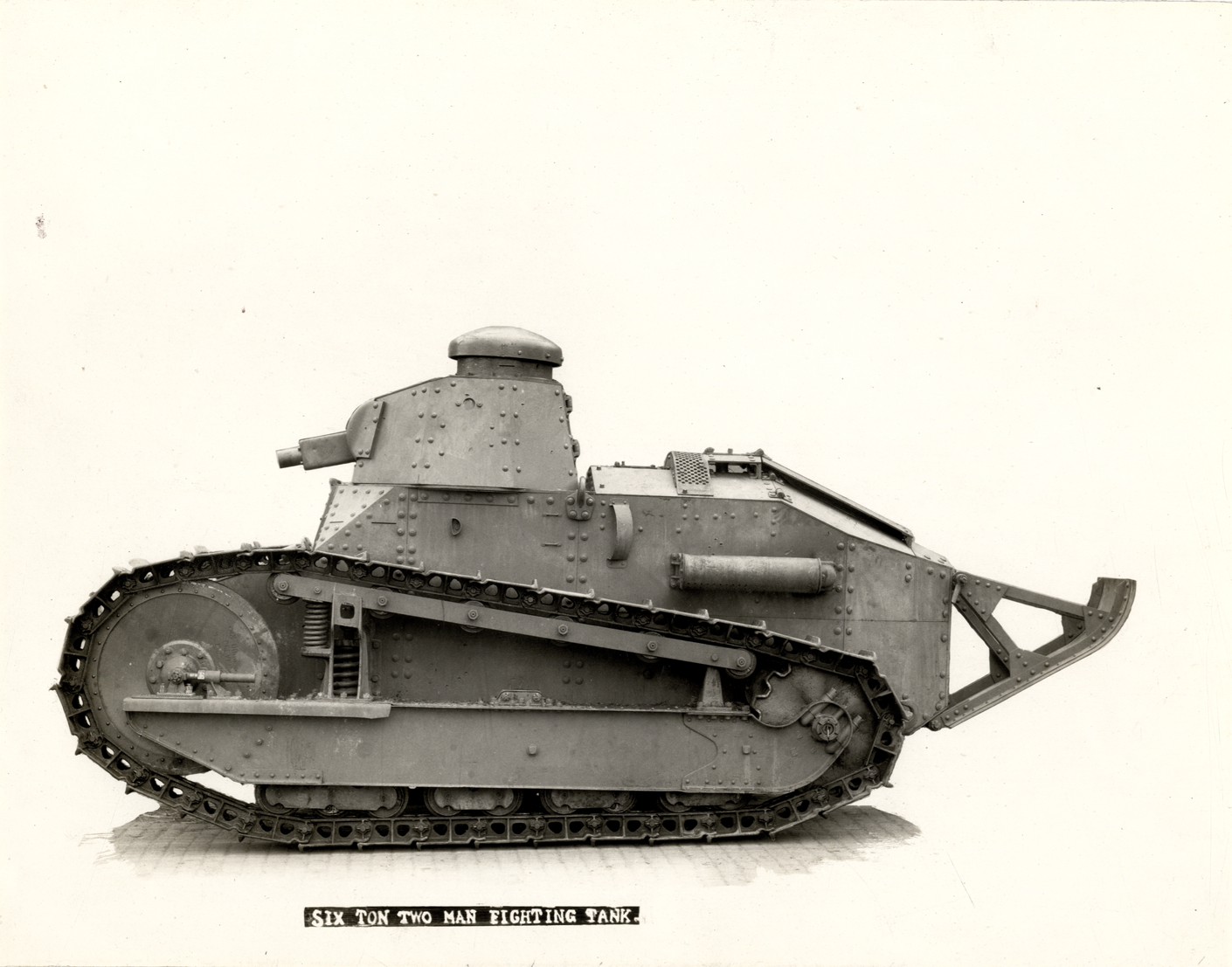 View of a six ton two man fighting tank. Printed on front: "Six ton two man fighting tank." Typed on back: "MS/W. Ledyard Mitchell collection, accession 20, National Automotive History Collection, Detroit Public Library. Subject: Military equipment, 1914-1918--Tanks. Date: 1914-1918. Source: As above collection. Identification: Six ton two man fighting tank."
