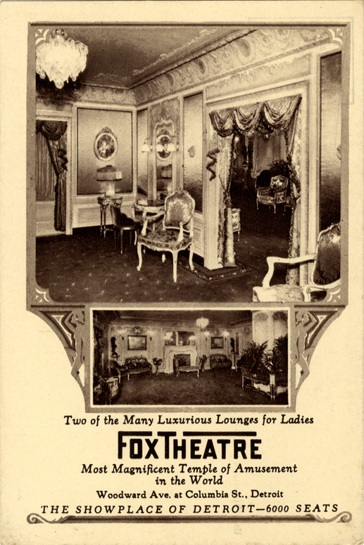 View of two lounges in the Fox Theatre. Rooms are furnished with chairs, fireplace, lamps and sofa. Printed on front: "Fox Theatre. Two of the many luxurious lounges for ladies. Most magnificent temple of amusement in the world. Woodward Ave. at Columbia St., Detroit. The showplace of Detroit, 6000 seats."