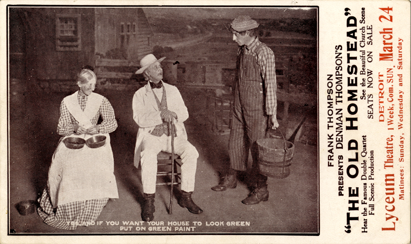 View of three actors in a scene from the play, "The old homestead," performed at the Lyceum Theatre. Printed on front: "'Yes, and if you want your house to look green put on green paint.' Frank Thompson presents Denman's Thompson's 'The old homestead.' Hear the famous double quartet, full scenic production. See the beautiful church scene. Seats now on sale. Lyceum Theatre, Detroit. 1 week, Com. Sun, March 24. Matinees: Sunday, Wednesday and Saturday." Printed on back: "Coming. A correspondent writing from New York City says, concerning Denman Thompson's 'The old homestead.' 'The old homestead,' which was one of the recent attractions at the Academy of Music, is one of the residenters of the stage. Each year a fortune is gathered in by the old standby, which is now in its twenty-sixth year. It is never allowed to run down, nor is the company permitted to be weaned nor to grow slack or careless in portraying the various roles. Plays like this and other, which are close to the soil, have a distinct value to the theatre. They draw a certain clientele that will not come out to any other play, no matter how good it may happen to be. Yesterday afternoon I saw 'The old homestead.' A gentleman in the audience pointed out to me a sweet-faced and gray-haired woman who was enjoying her first play. She was at least sixty-five, perhaps a little older. It was a pleasure to watch that woman as she followed the unfolding of the homely but touching story. One could almost read in her face the things that pleased most. What an experience that must have been. Think of living so many years and without ever having been inside of a theatre. The veteran playgoer would have difficulty in picturing even remotely the sensations that the presentation of a strong and wholesome play like 'The old homestead' would make upon them."