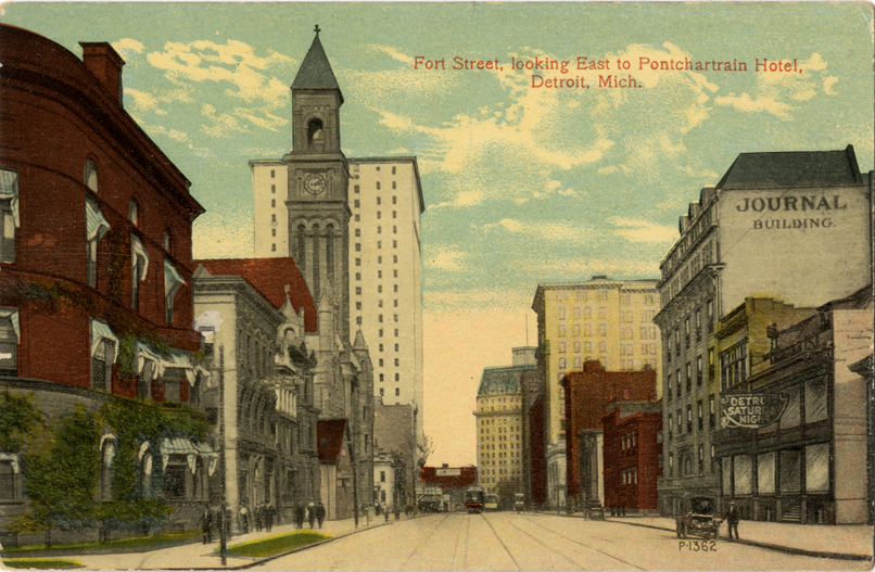 View of commercial buildings on Fort Street, with Hotel Pontchartrain in background. Printed on front: "Looking east to Pontchartrain Hotel, Detroit, Mich."
