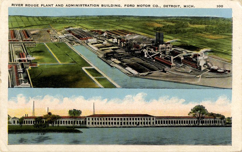 View of the Rouge River Plant and Administration building of the Ford Motor Company. Printed on front: "River Rouge Plant and Administration building, Ford Motor Co., Detroit, Mich." Printed on back: "Tichnor quality views." Handwritten on back: "Dear Aunt & Cousin, We are just fine and are going to live by ourselves soon. I will certainly be glad. We had dandy luck all the way. We seen lot of Detroit today. Ira is going to work in the morning. I am going to stay with Ruby tomorrow. I have walked uptown twice since I have been here. Ruby is sick. Ha! Ha! Will write more latter [sic], Ella and Ira."