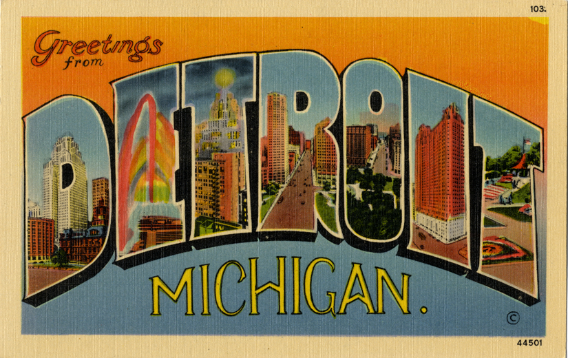 Souvenir postcard of scenes from Detroit. Printed on front: "Greetings from Detroit, Michigan." Printed on back: "Pub. by United News Co., Detroit, Mich. Metrocraft, Everett, Mass."