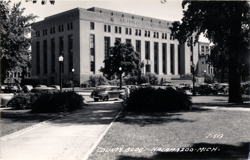 View of the Kalamazoo County Building, Michigan. Printed on front: "County Building, Kalamazoo, Mich." Printed on back: "All rights reserved. The L.L. Cook Co., Milwaukee."