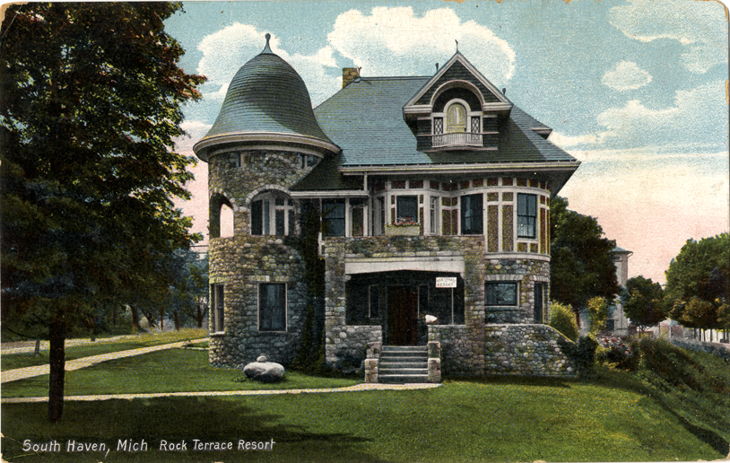 View of the Rock Terrace Resort in South Haven, Michigan. Printed on front: "South Haven, Mich. Rock Terrace Resort." Printed on back: "The Hugh C. Leighton Co., manufacturers, Portland, Me., U.S.A. Made in Germany, 8751." German language message handwritten on back. Card is postmarked September 6, 1911.
