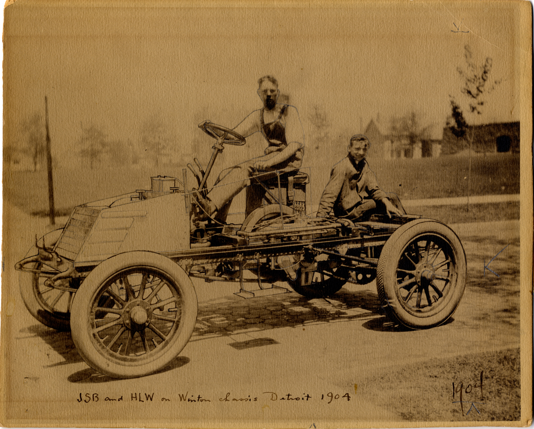 View of James Scripps Booth and Harold Wallace on a 1904 Winton automobile chassis. Typed on back: "Subject: Biography--Booth, James Scripps. Collection: MS10/James Scripps Booth Collection. Date: 1904. Location: Detroit, Mich. Source: John M. Booth. I.D.: James S. Booth and Harold Wallace in Booth family's 1904 Winton automobile. The Winton was a two cylinder with the first Michigan license no. 649, May 13, 1904." Handwritten on back: "2 cylinder Winton, first Michigan license no. 649, May 13, 1904. JSB at wheel, Harold Wallace in Detroit."