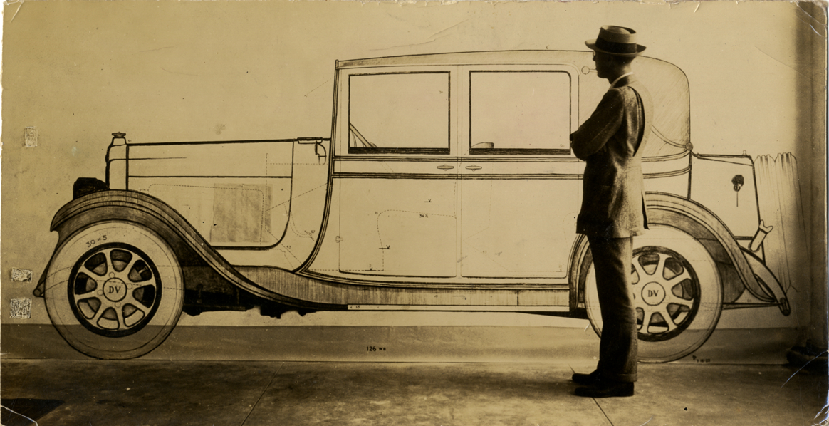 James Scripps Booth posing with drawing of Da Vinci automobile