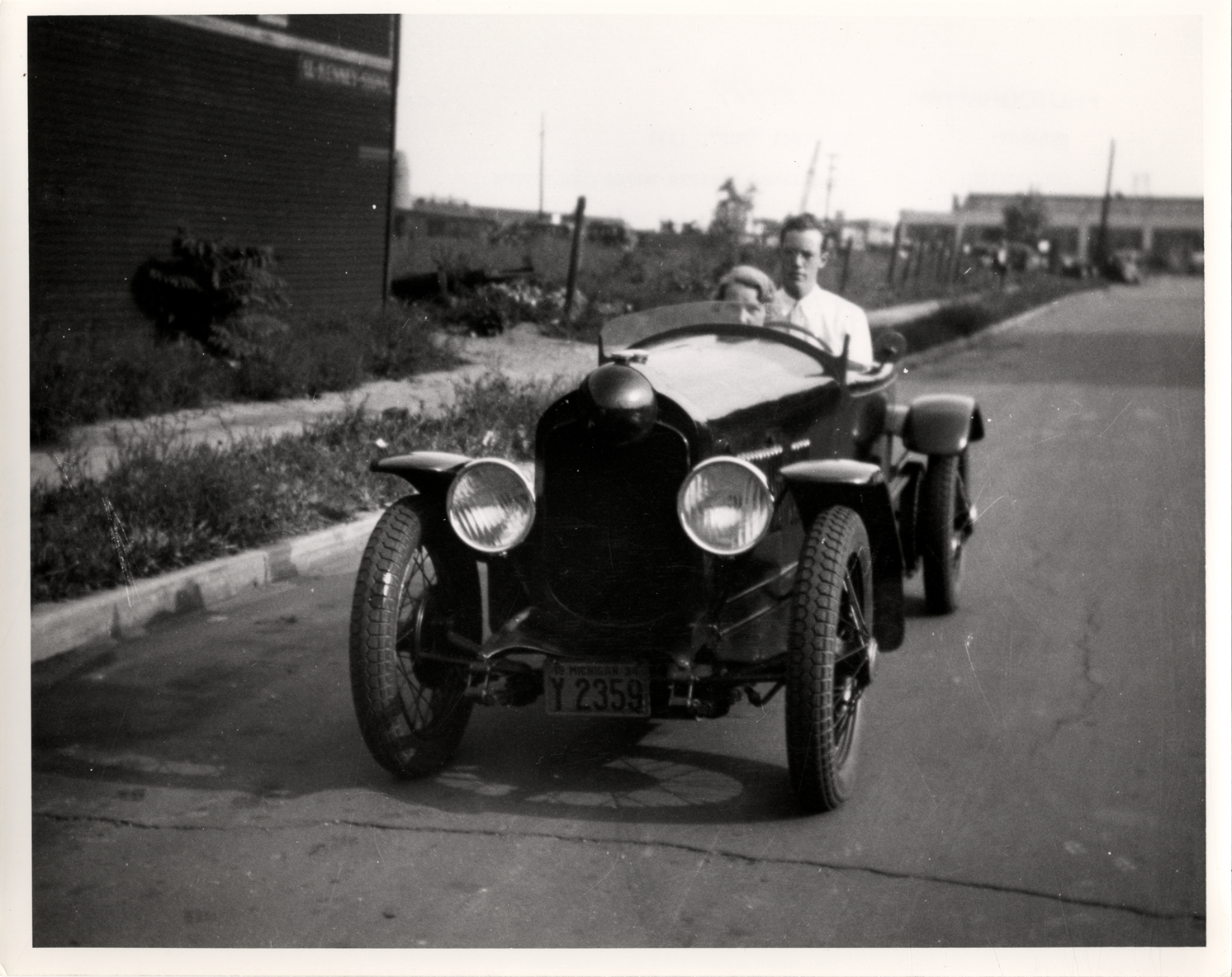 View of John M. Booth and Ellen Norlen in a Da Vinci "Pup" cyclecar, designed by James Scripps Booth. Typed on back: "Subject: Da Vinci 'Pup,' 1929. Collection: MS10/James Scripps Booth Collection. Date: 1934. Location: Detroit, Mich. (at Terminal Avenue shop?) Source: John M. Booth. I.D.: Ellen Norlen and John M. Booth in car. Car designed 1921, built 1929, by James S. Booth. Front view."