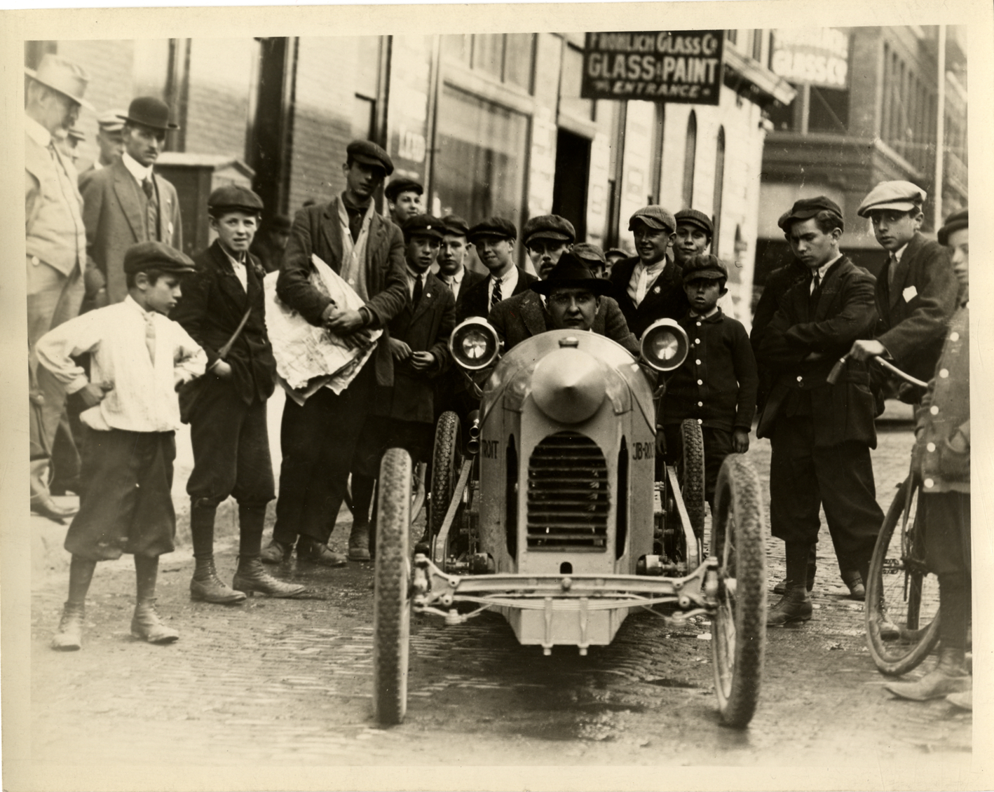 View of John Scripps Booth and John Batterman posing in a JB Rocket cyclecar. Onlookers in background. Typed on back: "Subject: Scripps-Booth cyclecar, J.B. Rocket, 1913. Collection: MS10/James Scripps Booth Collection.Location: Detroit, Mich. Photographer: Unknown. Source: John M. Booth. Identification: As written above. JB Rocket, front view, with John Batterman in front seat, JSB at wheel." Handwritten on back: "Original 1913 J-B Rocket cyclecar, the first Scripps-Booth, weight 750 lbs., leather vee belt drive, 2 cyl vee air cooled motor. This car now all refinished in sage green with yellow wheels, new upholstery in khaki, etc. Inside of body black with mahogany trim sticks. John Batterman in front seats, brother-in-law to Ralph Booth."