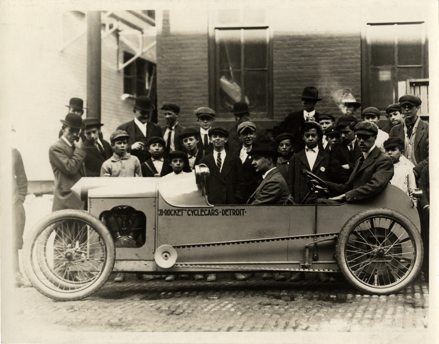 View of John Scripps Booth and John Batterman posing in a JB Rocket cyclecar. Onlookers in background. Typed on back: "Subject: Scripps-Booth cyclecar, J.B. Rocket, 1913. Collection: MS10/James Scripps Booth Collection.Location: Detroit, Mich. Source: John M. Booth. Identification: As above. James S. Booth, at wheel; passenger is John Batterman, his brother-in-law. Car weight: 750 lbs.; 2 cyl. vee air cooled motor; leather vee belt drive. JB Rocket, side view, with John Batterman in front seat, JSB at wheel."