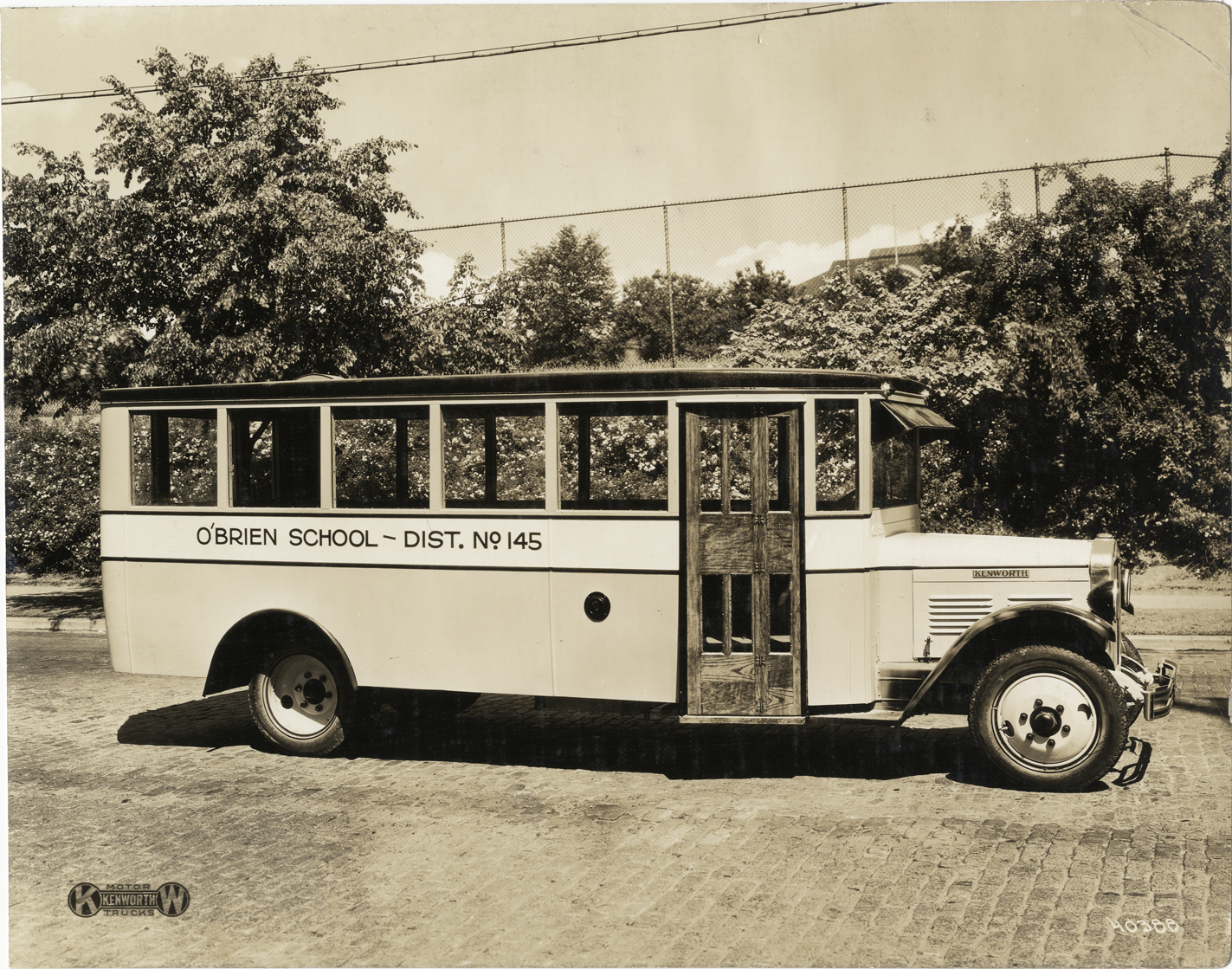 View of a Kenworth school bus for the O'Brien School, District no. 145. Printed on front: "Kenworth motor trucks." Stamped on back: "Model 100, gross vehicle weight allowance 10000 pounds, including chassis weight, body and load. Walter P. Miller, commercial photography, phone Main 8875, 1 Stuart Building, Seattle, Washington."