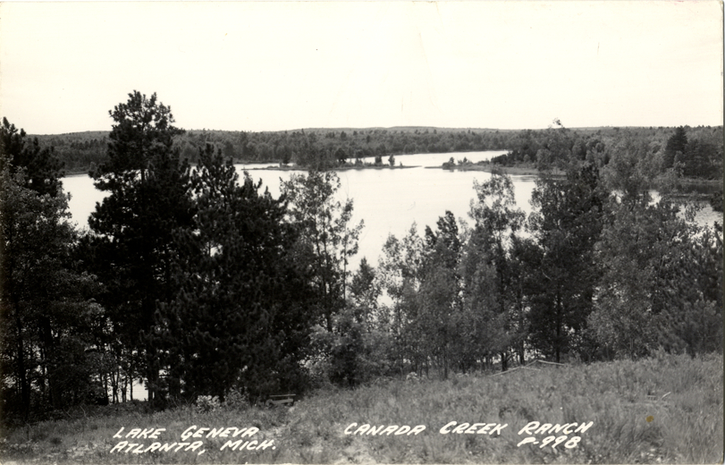 View of Lake Geneva from the Canada Creek Ranch in Atlanta, Michigan. Printed on front: "Lake Geneva, Canada Creek Ranch, Atlanta, Mich. P-998." Printed on back: "All rights reserved. The L.L. Cook Co., Milwaukee."