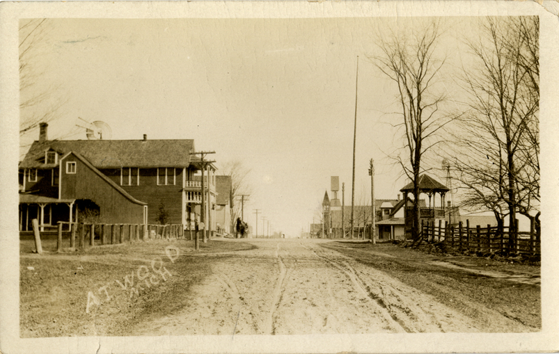 View of commercial buildings on a street in Atwood, Michigan. Printed on front: "Atwood, Mich." Handwritten on back: "Dear Mother, We are 12 mi. from Charlevoix. And have gone 9 miles since morning. We started at 6:15 and it is 9:45 now. Ed [undecipherable]." Card is postmarked July 7, 1911.