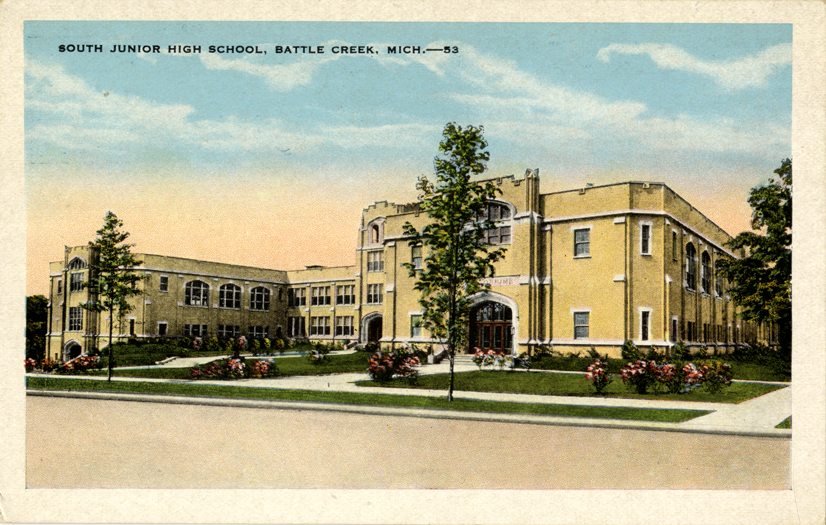 View of the South Junior High School in Battle Creek, Michigan. Printed on front: "South Junior High School, Battle Creek, Mich. 53." Printed on back: "Battle Creek has a school system second to none, well-paid and efficient teachers, and maintains a thoroughly equipped vocational school. Made in U.S.A. by E.C. Kropp Co., Milwaukee."