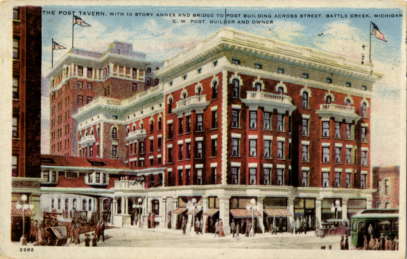 View of the Post Tavern in Battle Creek, Michigan. Printed on front: "The Post Tavern, with 10 story annex and bridge to Post Building across street, Battle Creek, Michigan. C.W. Post builder and owner." Card is postmarked August 4, 1913.