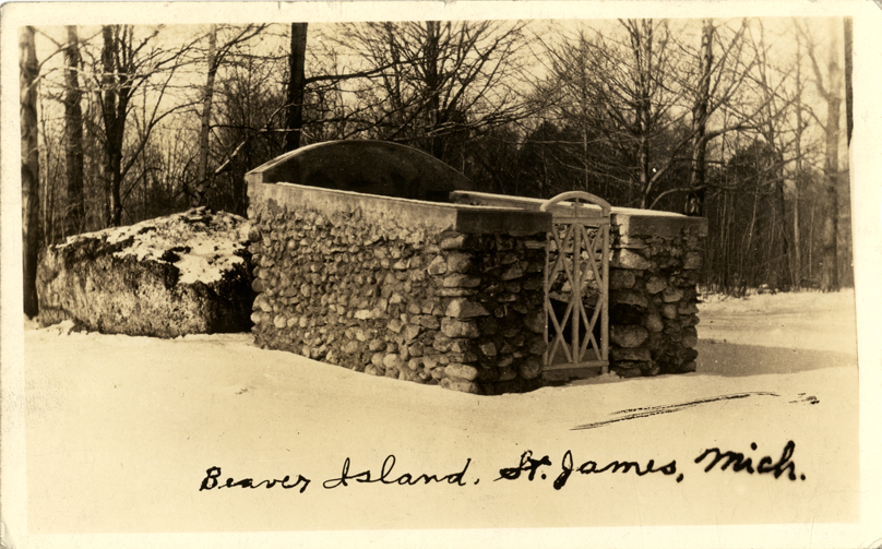 View of stone enclosure with gate in St. James, Michigan on Beaver Island. Printed on front: "Beaver Island, St. James, Mich."