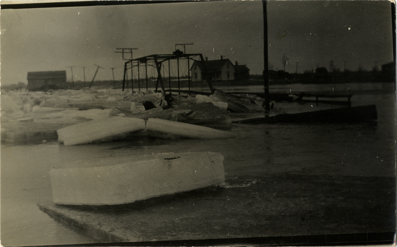 View of ice on river in Beaverton, Michigan. Iron bridge and houses in background. Handwritten on back: "Ice in Beaverton."