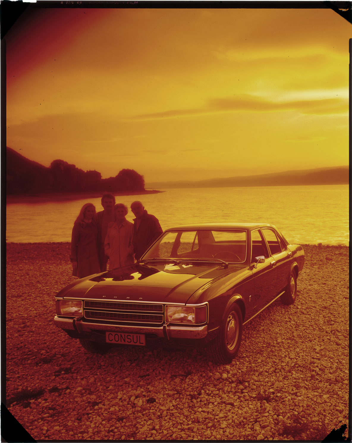 View of men and women posing with a Ford Consul sedan on the beach. Label on sleeve: "Ford British, Consul, 1970s."