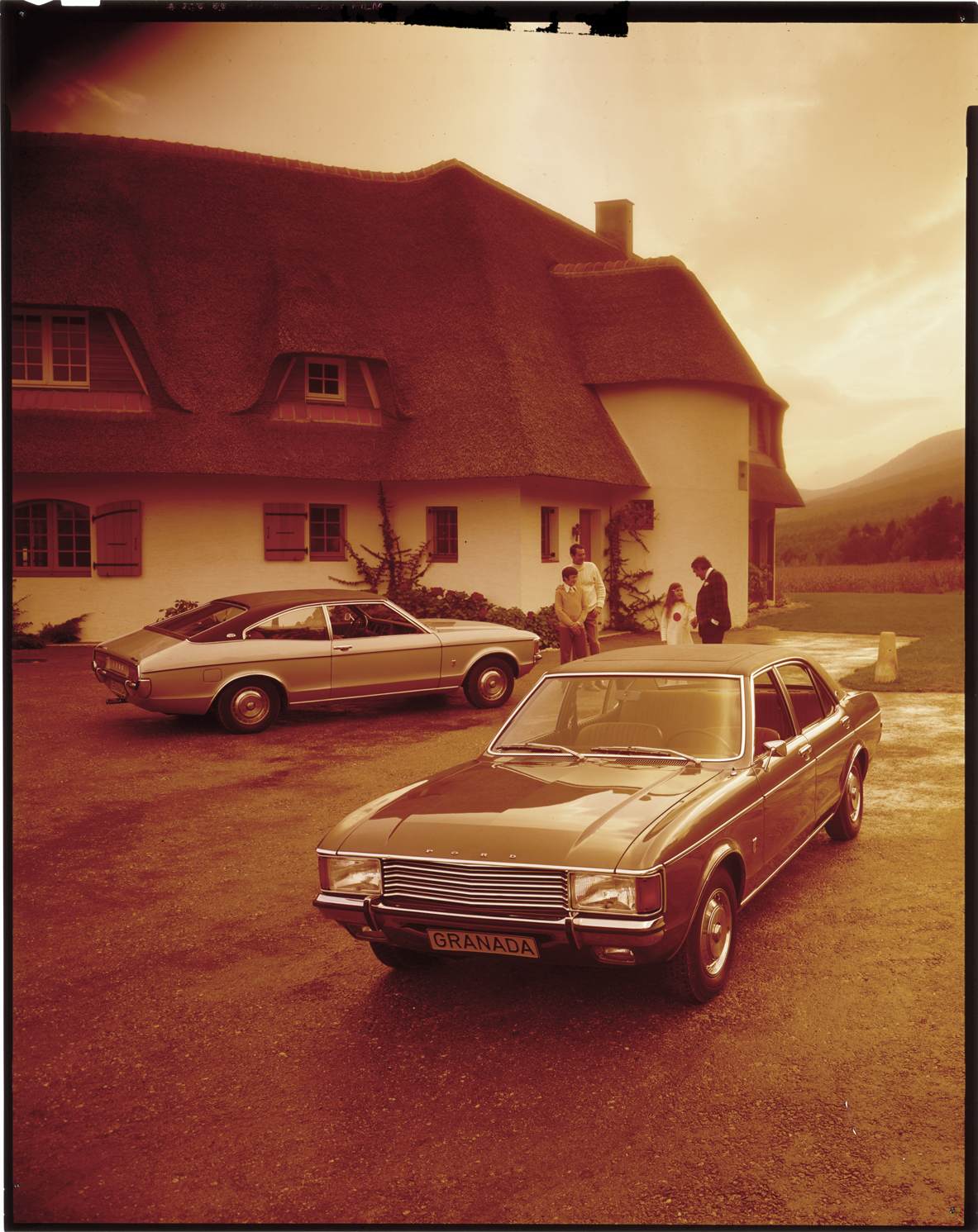 View of a Ford Granada sedan and coupe, parked in front of a house with thatched roof. Two men, a girl and a boy in background. Label on sleeve: "Ford British, Granada, 1970s."
