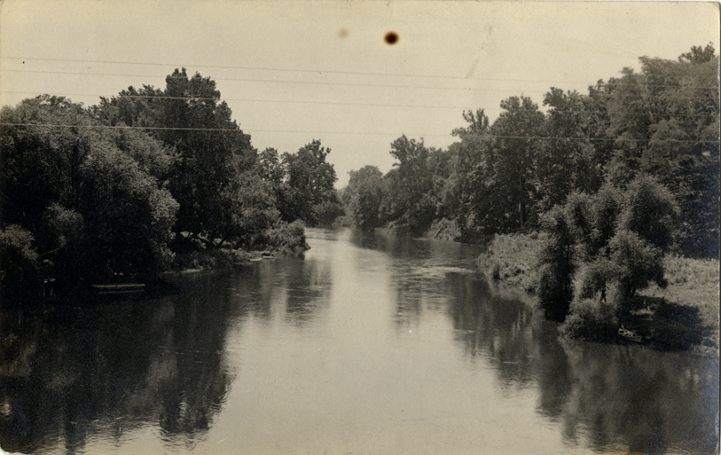 View of the St. Joseph River in Berrien Springs, Michigan. Printed on back: "[C.R. Childs] ... post cards, Chicago." Handwritten on back: "Along the old St. Joe at Berrien Springs, Mich."
